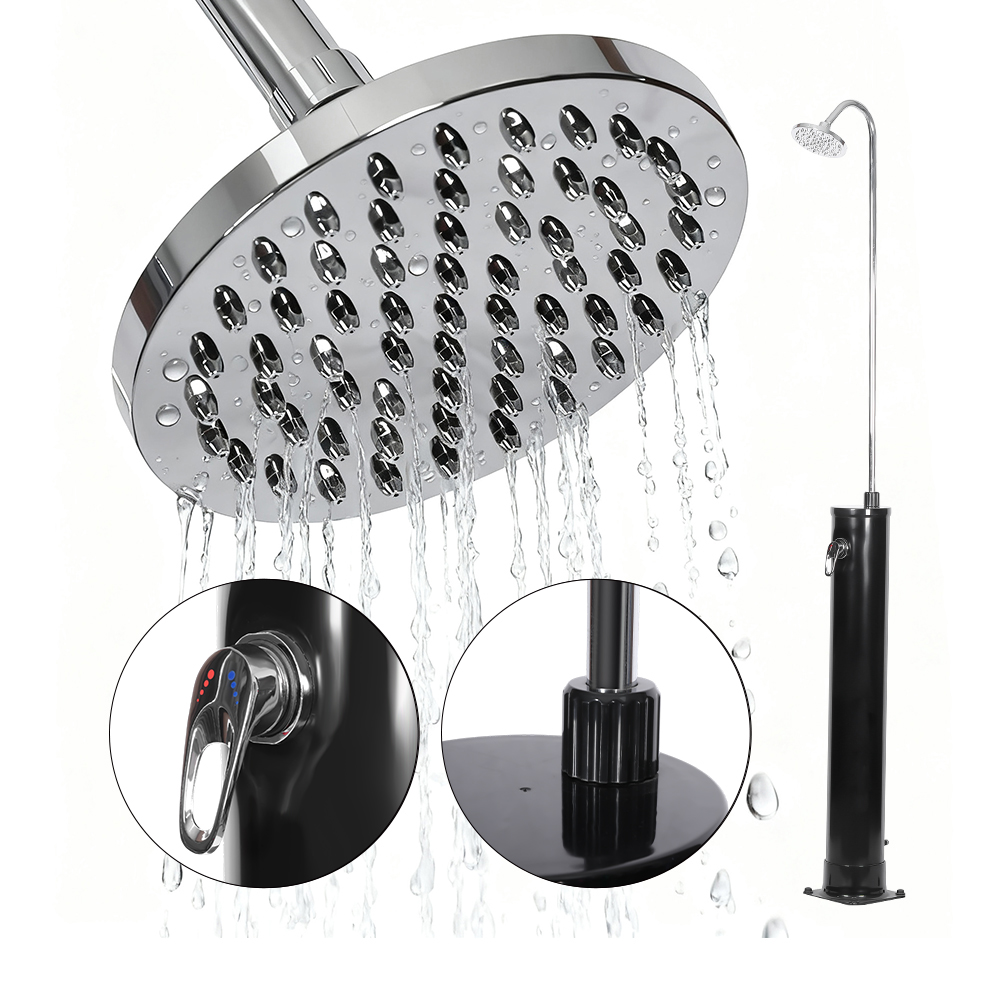 Bij blootstelling aan sterk zonlicht kan het water in de douchepijp van 18/20 liter op natuurlijke wijze opwarmen tot ongeveer 60°C, zonder dat er elektriciteit nodig is, wat een handige en milieuvriendelijke doucheoplossing biedt. Sluit eenvoudig een gewone tuinslang aan om de douchepijp gemakkelijk te vullen. Deze LY18L01-B 18L ronde zonnedouche met buitentuinzwembad is gemaakt van UV-bestendig plastic en is ontworpen voor duurzaamheid en kan indien nodig gemakkelijk worden gedemonteerd en getransporteerd. De stevige basis van roestvrij staal, PVC, ABS, koper en metaal zorgt voor betrouwbare stabiliteit en houdt het apparaat veilig op zijn plaats, zelfs bij veelvuldig gebruik. Bovendien is hij voorzien van een standaard tuinslangaansluiting voor snel vullen en een aftapplug waarmee je de douchepijp eenvoudig kunt legen, waardoor je de douche eenvoudig kunt voorbereiden op winterstalling.