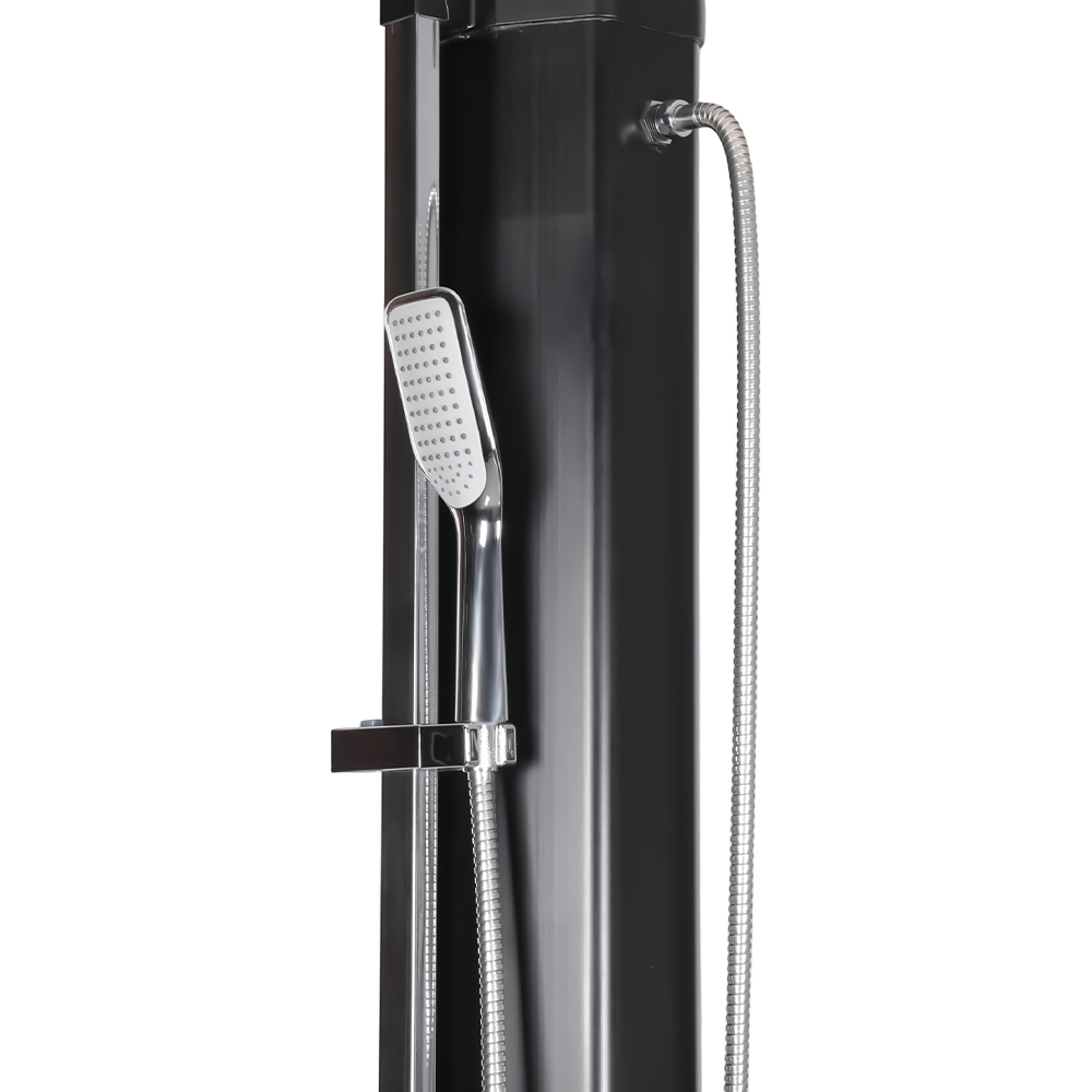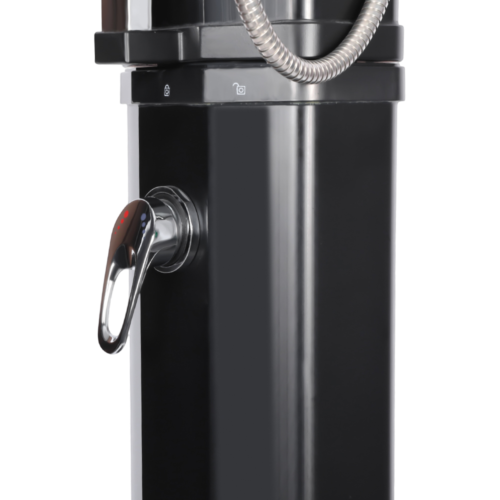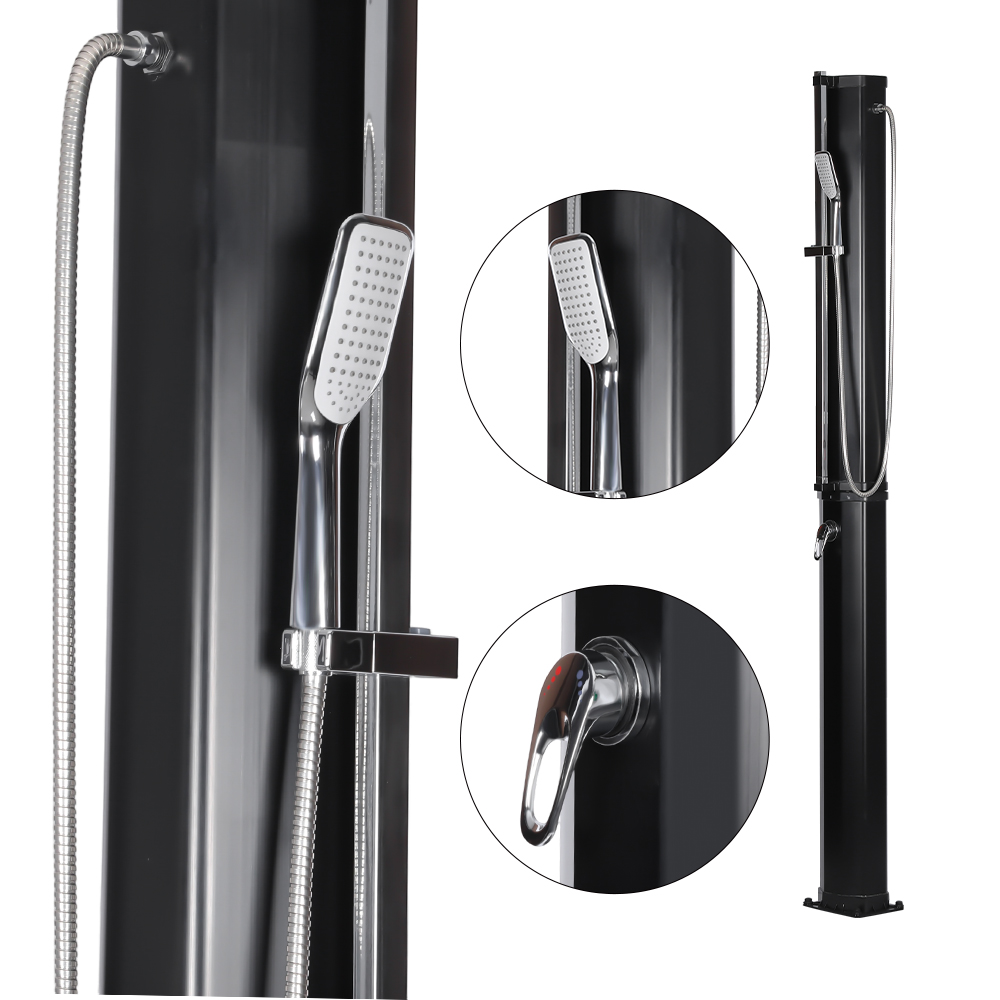 Deze LY35L08-HB stabiele en efficiënte zonnedouche met grote capaciteit werkt efficiënt met behulp van zonlicht. De grote douchepijp van 35 liter verwarmt het water tot ongeveer 60°C bij voldoende zonlicht. Bijvullen is eenvoudig, vereist geen elektriciteit en kan eenvoudig worden uitgevoerd door verbinding te maken met een standaard tuinslang. De grote regendouchekop zorgt voor een comfortabele verkoeling en dankzij het geïntegreerde kogelgewricht kan hij in verschillende hoeken tot 180° draaien. Installatie is ook erg handig. De algehele structuur is gemaakt van duurzaam, UV-bestendig plastic, dat effectief bestand is tegen langdurige blootstelling aan de buitenlucht. De douchekop kan snel worden gedemonteerd voor eenvoudig transport tussen locaties of opslag buiten het seizoen. Een stevige metalen basis zorgt voor stabiliteit en veiligheid zodra deze is geïnstalleerd, zodat u kunt genieten van een comfortabele buitendouche in uw tuin, bij het zwembad of op de camping.