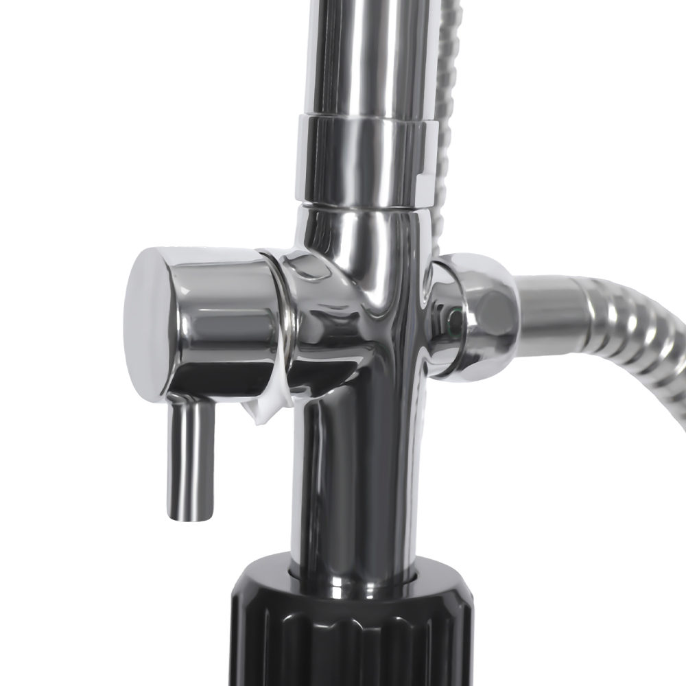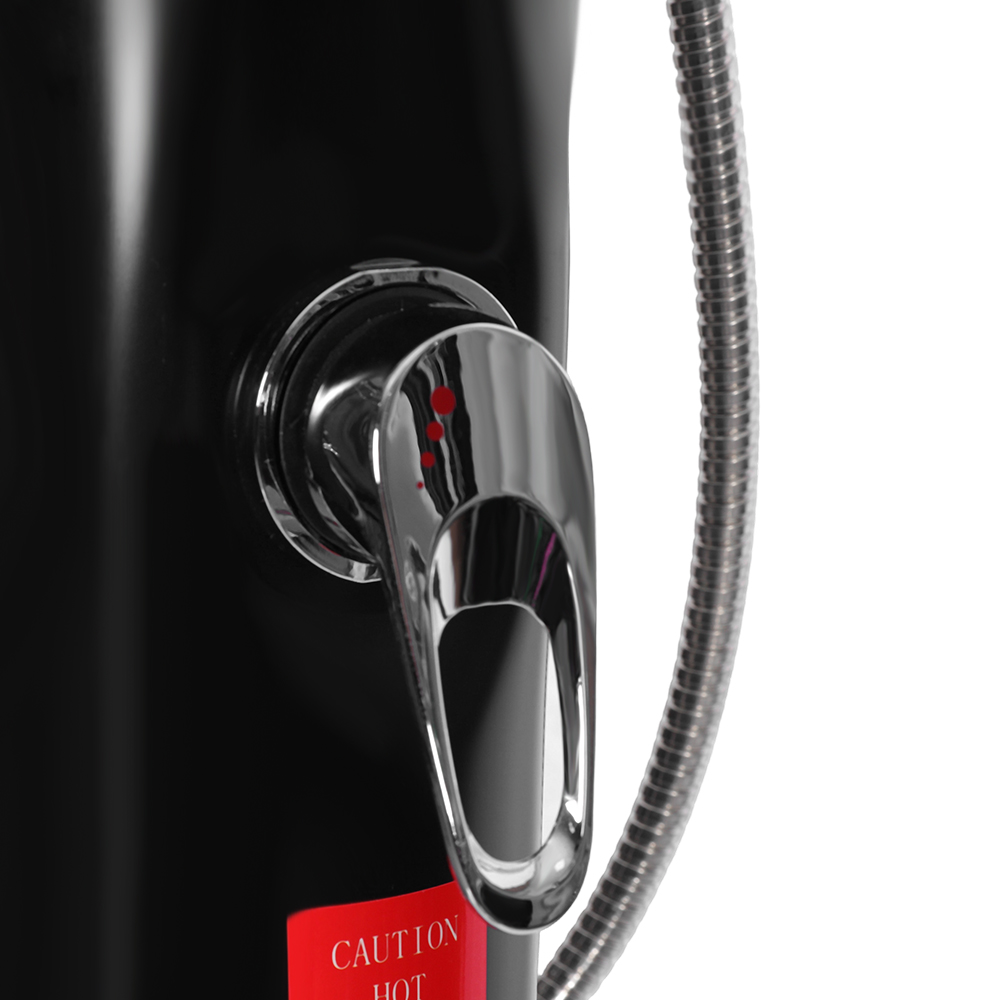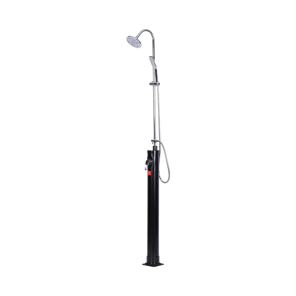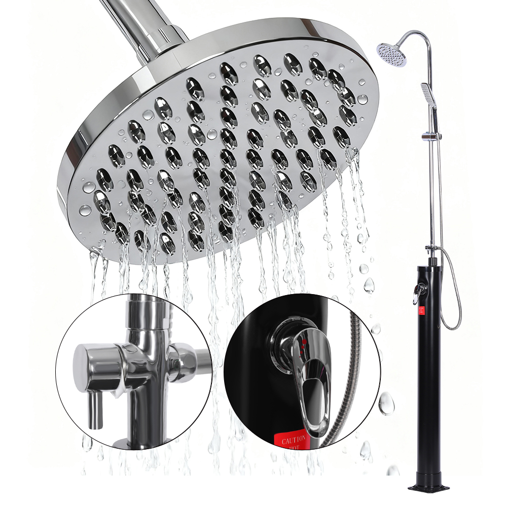 De LY08L03 8L buitendouche met zonnekolom in de tuin is voorzien van een eengreepsmengkraan die de watertemperatuur nauwkeurig regelt door warm water uit de douchepijp te mengen met koud water uit een tuinslang. Hij is uitgerust met een tuinslangaansluiting voor gemakkelijk vullen en een aftapplug die volledige waterafvoer mogelijk maakt voor een veilige winterstalling. De douche is gebouwd op een stevige roestvrijstalen basis voor stabiliteit. De afzonderlijke onderdelen van de douche zijn stevig vastgezet met schroeven en moeten voor veilig gebruik in de grond worden verankerd. Gebruiksaanwijzingen zijn inbegrepen en beschikbaar in meerdere talen.